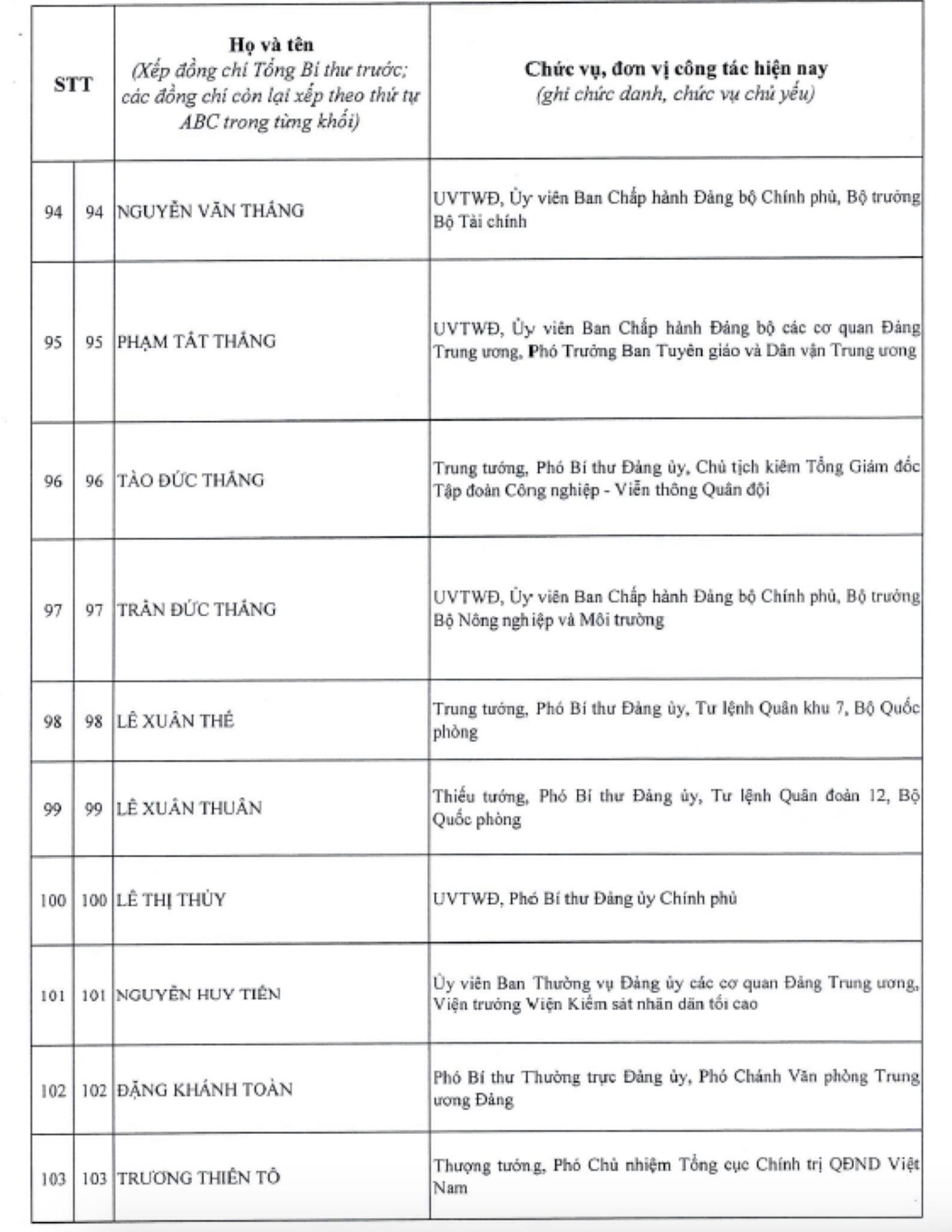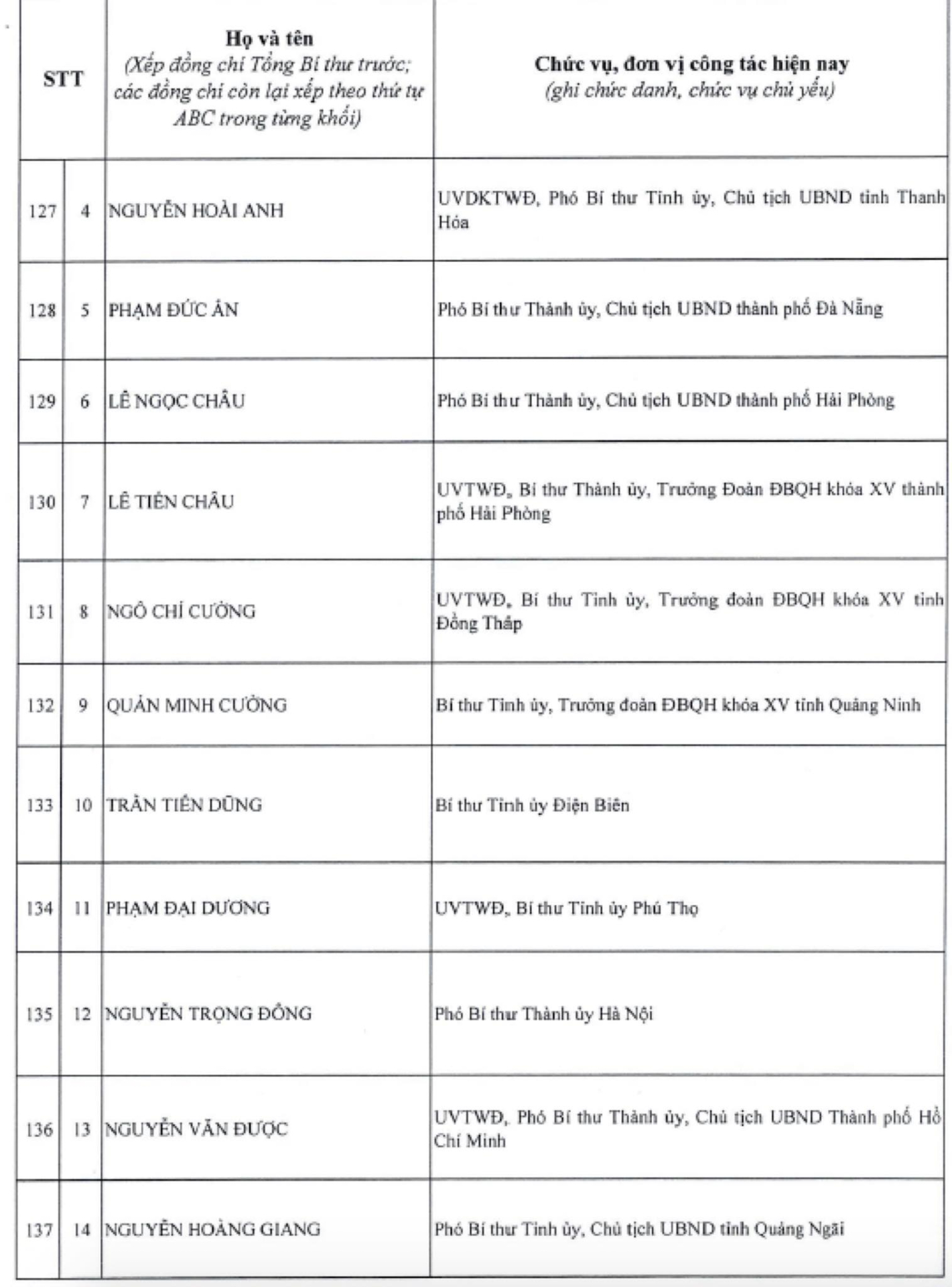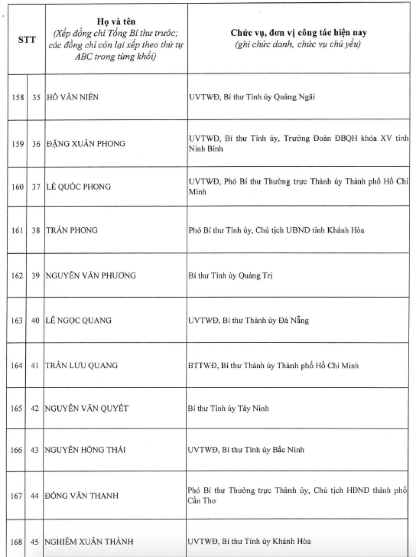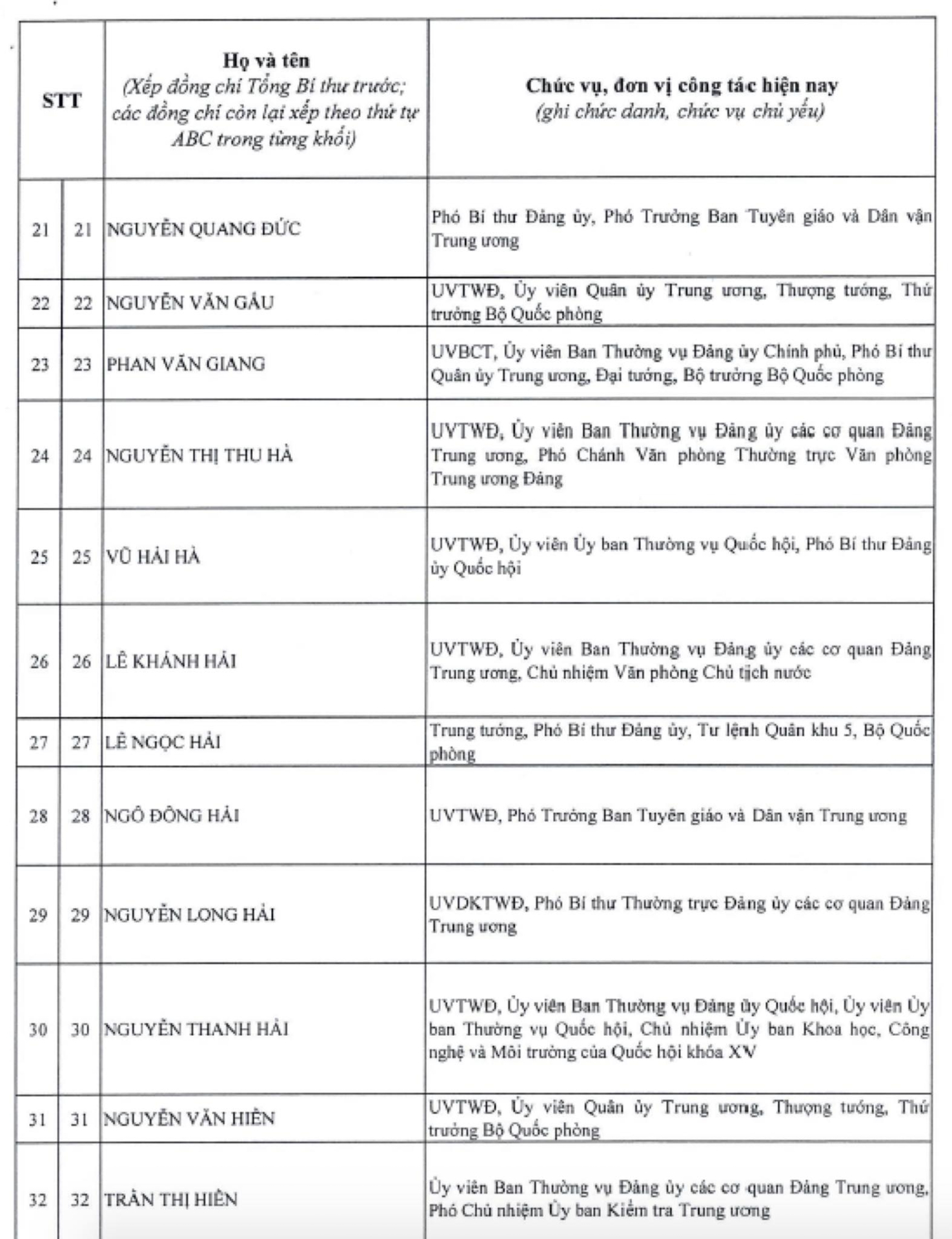 Danh sách 180 Ủy viên chính thức Ban Chấp hành Trung ương Đảng khóa XIV.