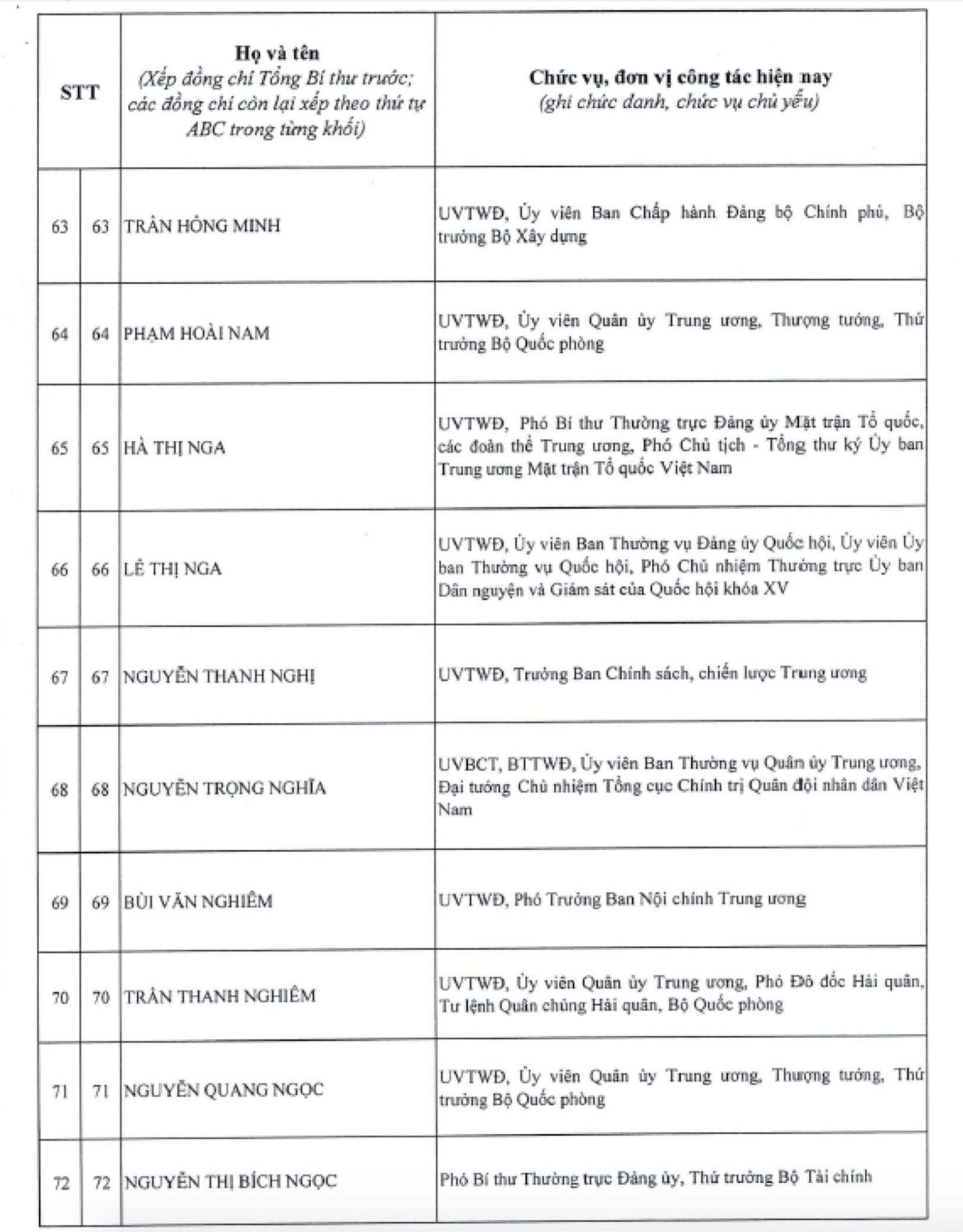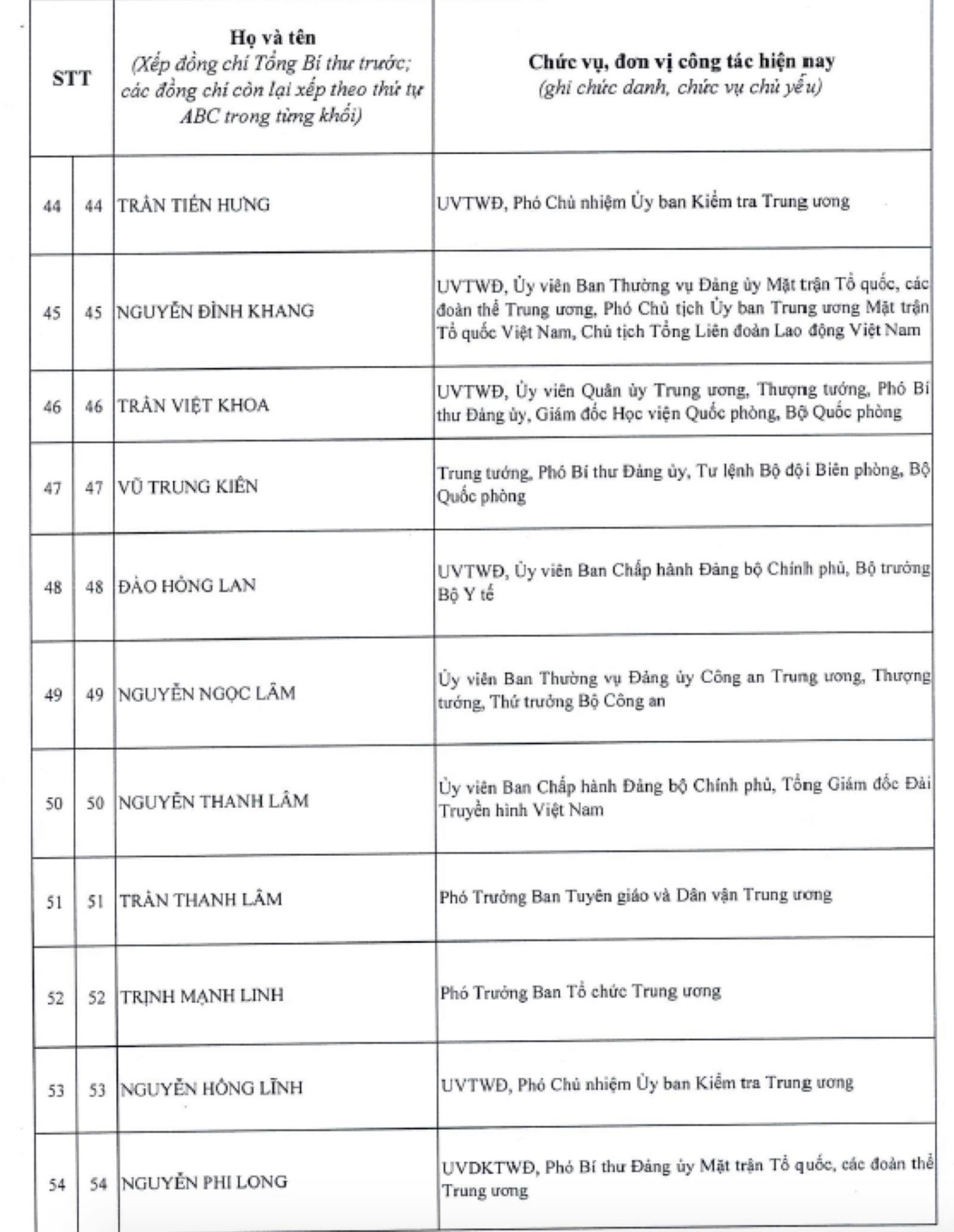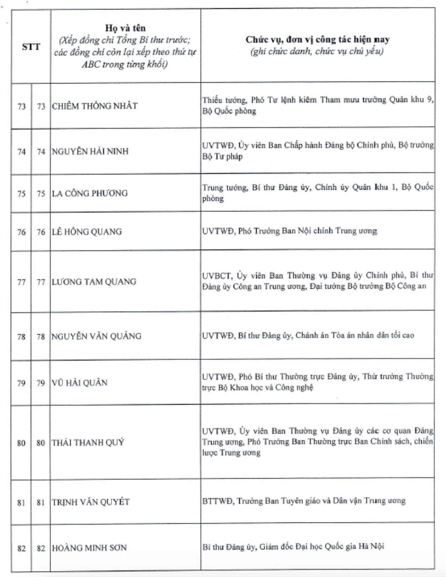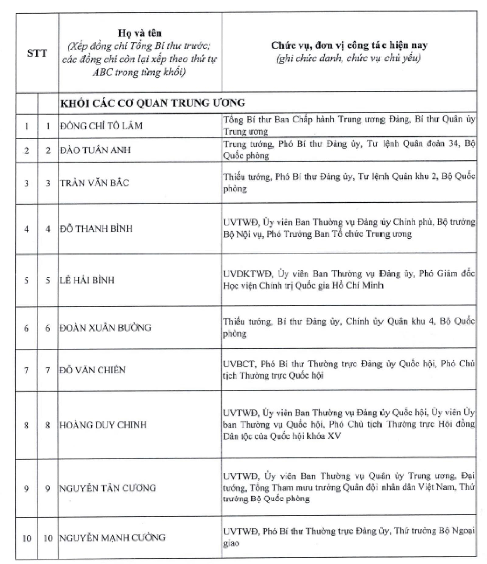 Danh sách 180 Ủy viên chính thức Ban Chấp hành Trung ương Đảng khóa XIV.
