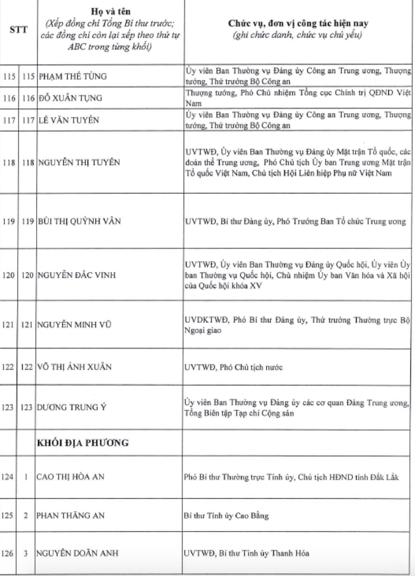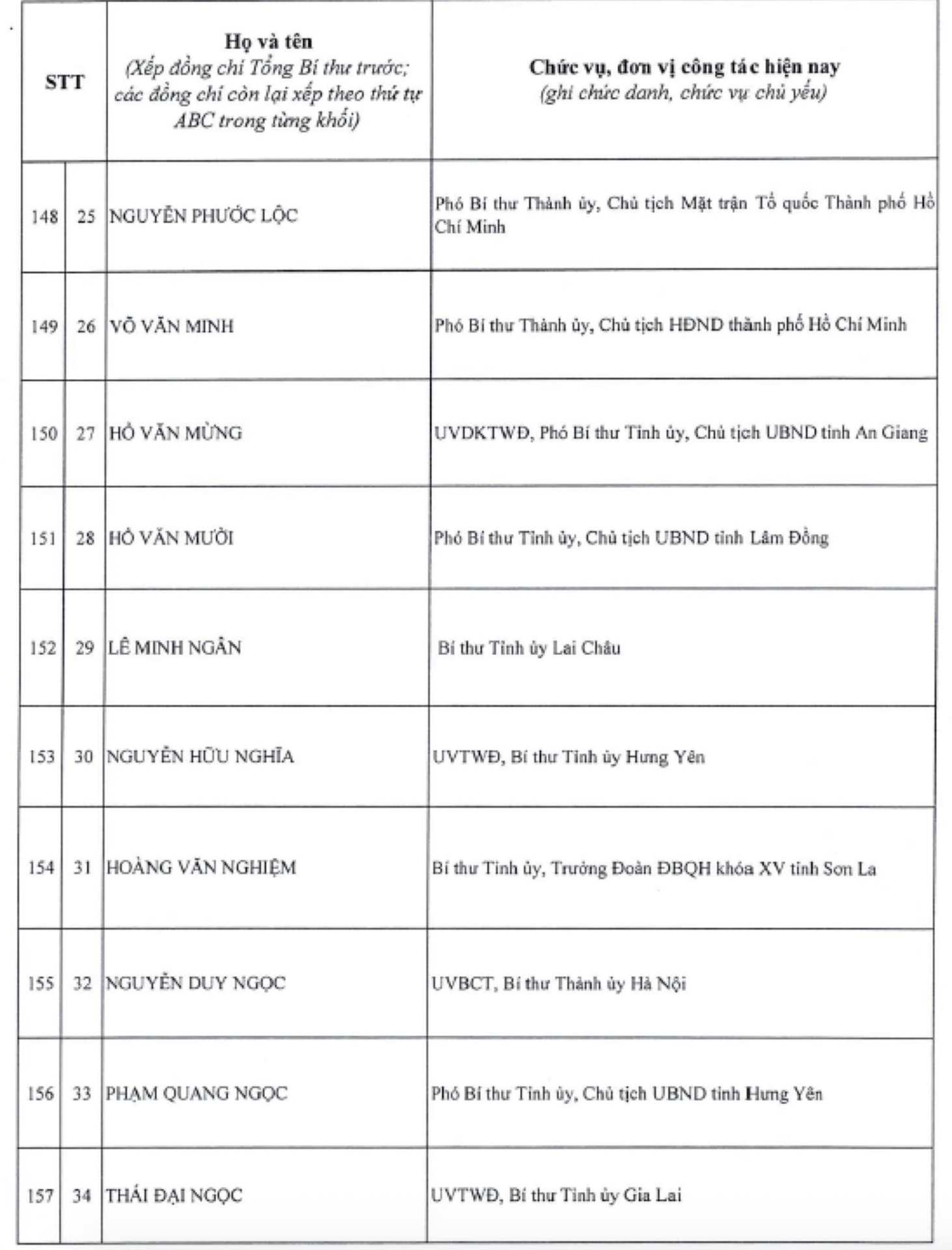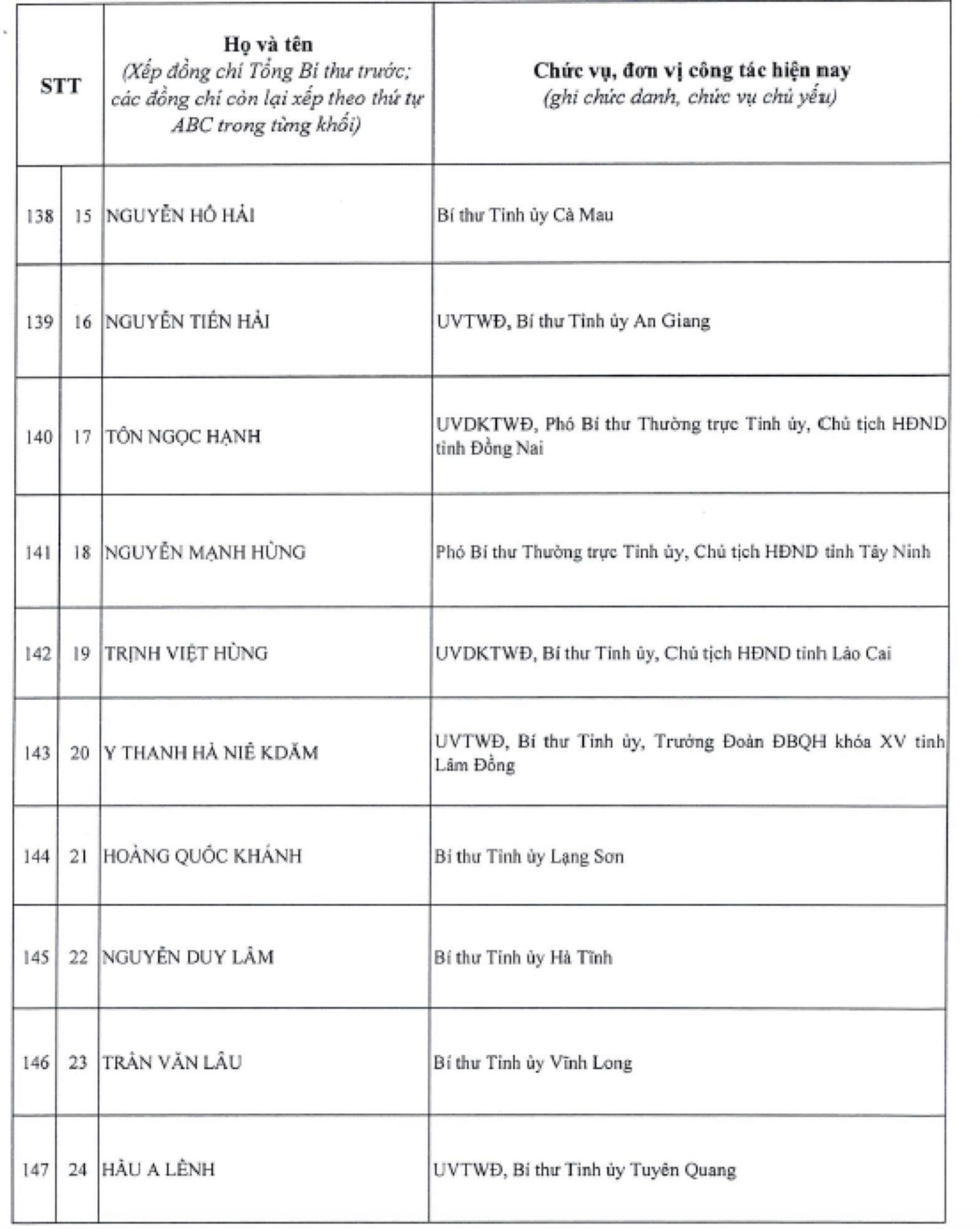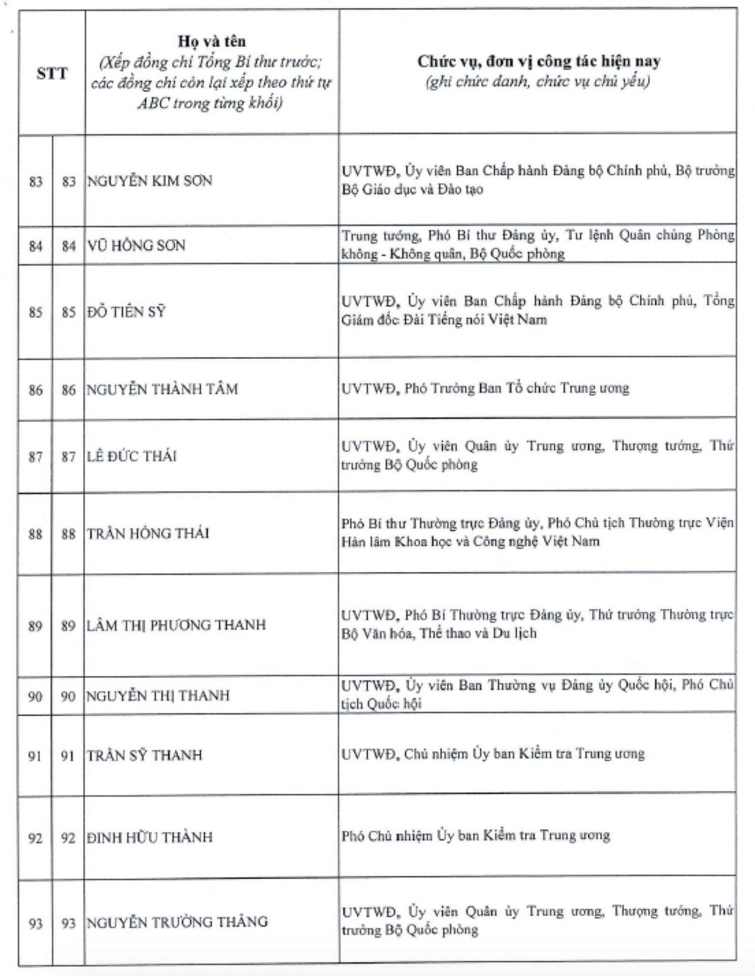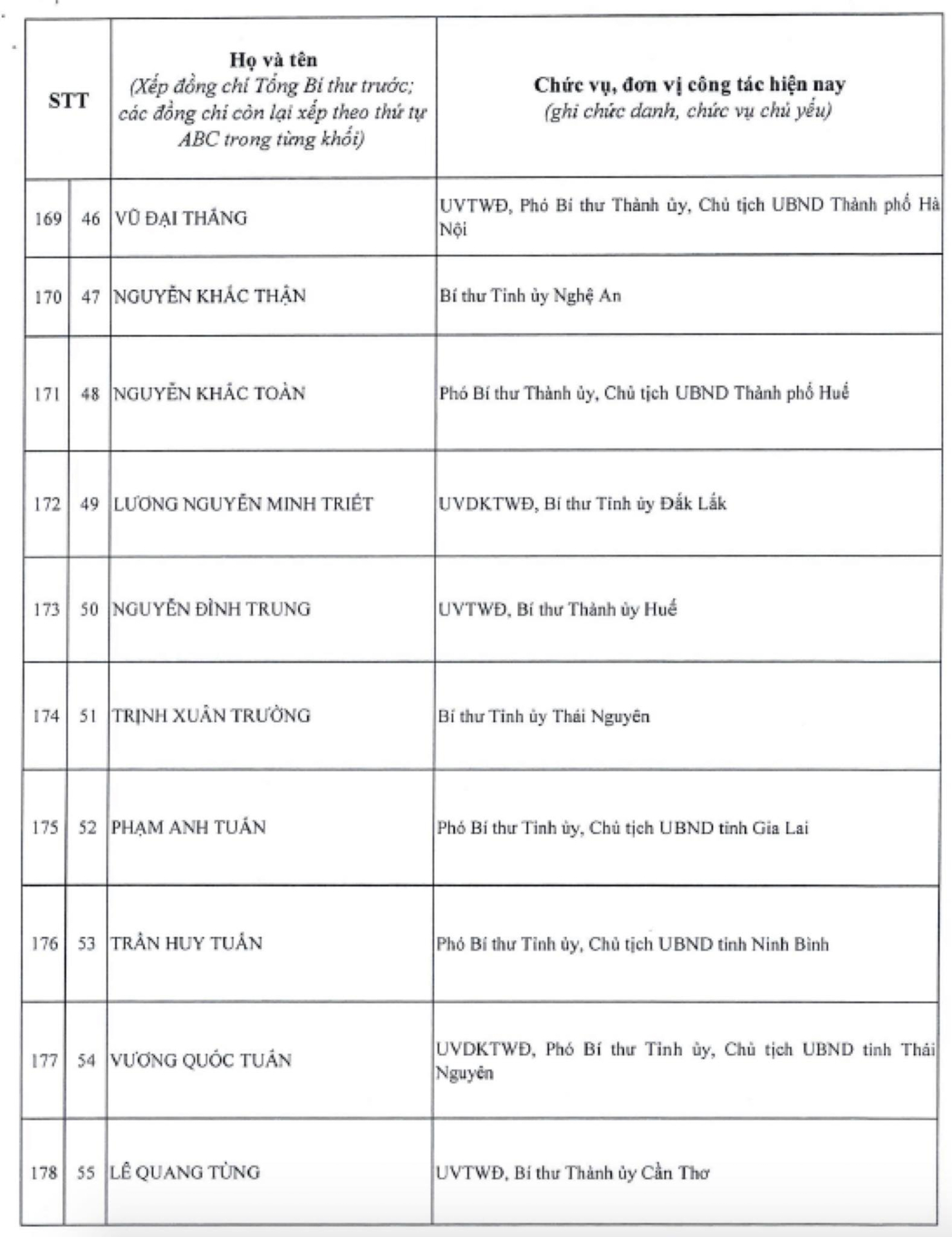Danh sách 180 Ủy viên chính thức Ban Chấp hành Trung ương Đảng khóa XIV.
