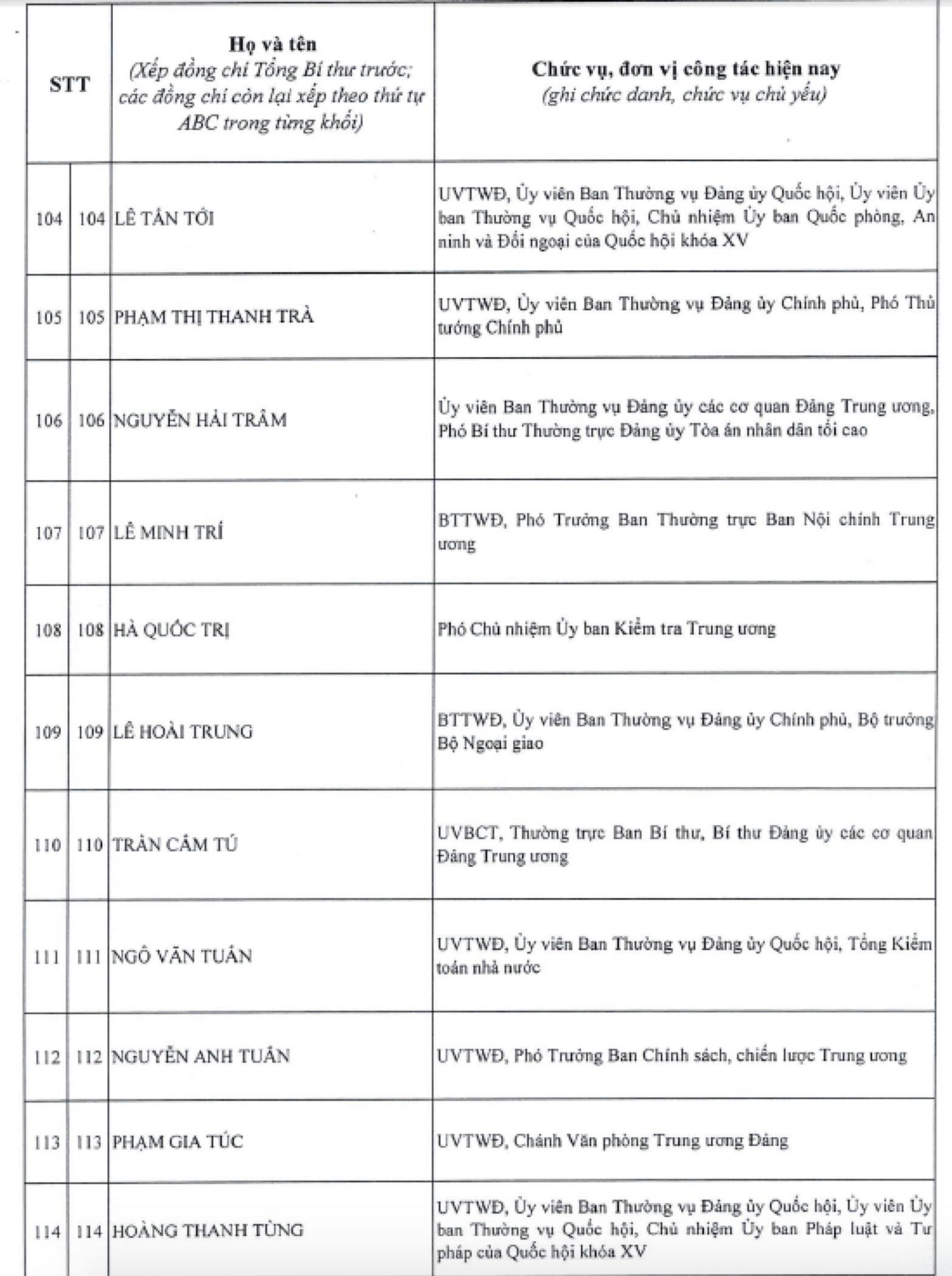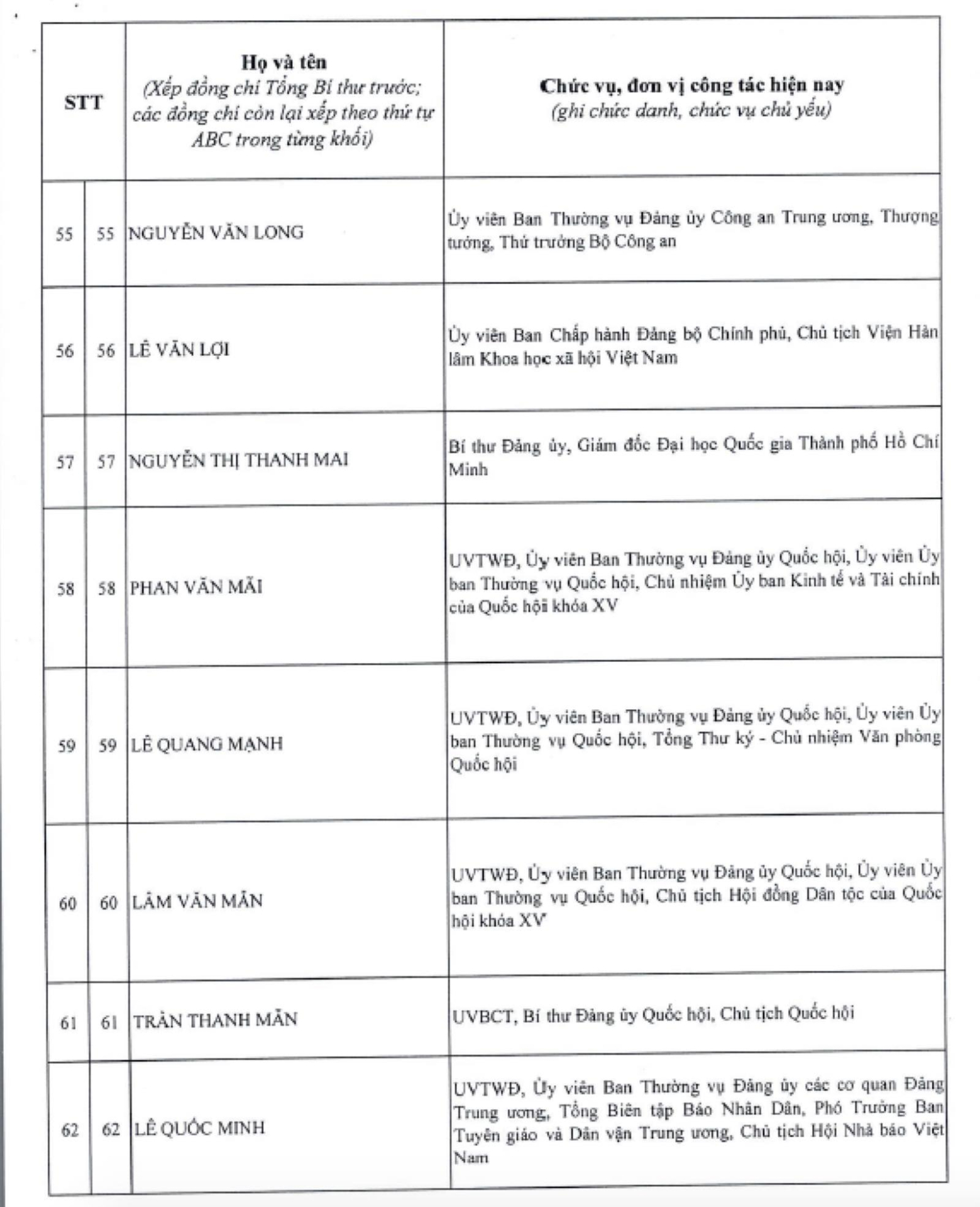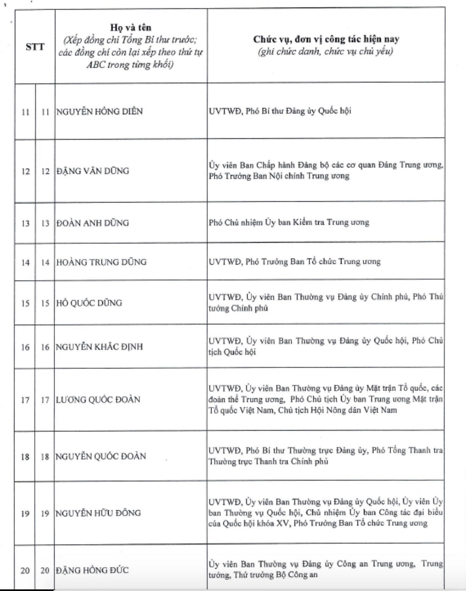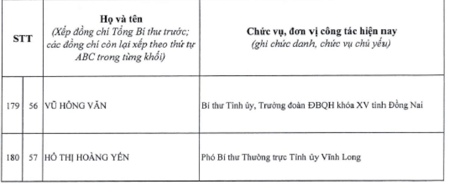 Danh sách 180 Ủy viên chính thức Ban Chấp hành Trung ương Đảng khóa XIV.