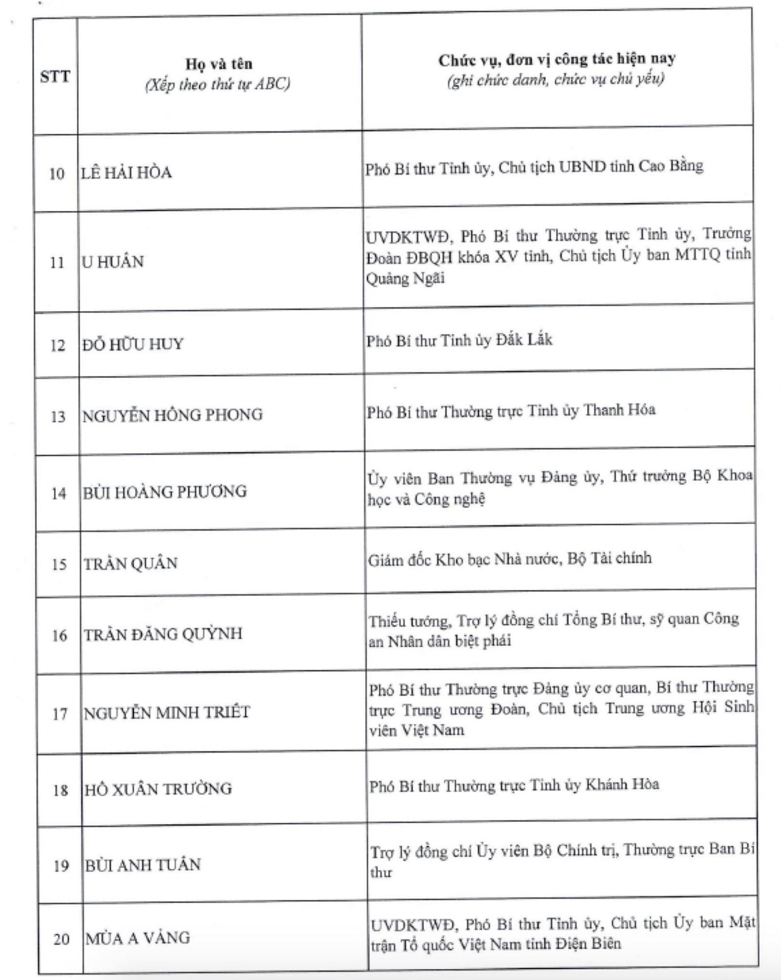 Danh sách 20 Ủy viên dự khuyết Ban Chấp hành Trung ương Đảng khóa XIV: