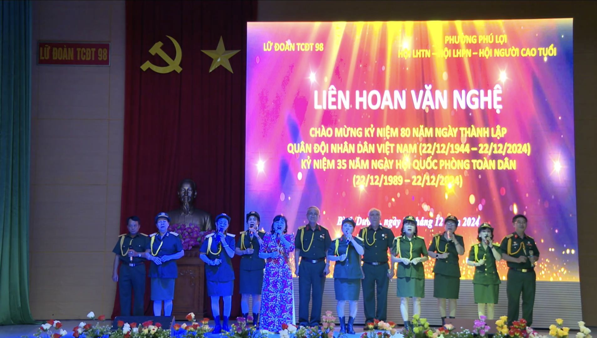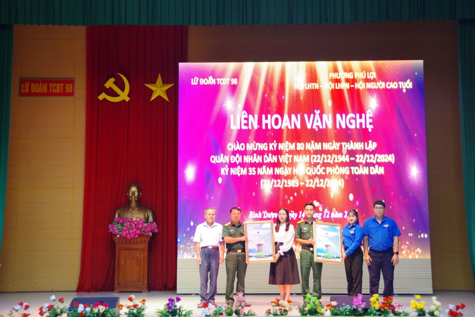 Vừa qua, tại hội trường đơn vị Lữ đoàn Tác chiến điện tử 98, Hội Liên hiệp Thanh niên, Hội Liên hiệp Phụ nữ, Hội Người cao tuổi phối hợp cùng Lữ đoàn Tác chiến điện tử 98 tổ chức thành công chương trình nghệ thuật “Đêm nhạc truyền thống” chào mừng chào mừng kỷ niệm 80 năm ngày truyền thống Quân đội nhân dân Việt Nam (22/12/1944 – 22/12/2024); kỷ niệm 35 năm ngày hội Quốc phòng toàn dân (22/12/1989 / 22/12/2024) và chào mừng Đại hội đại biểu Đảng bộ phường Phú Lợi lần thứ V, nhiệm kỳ 2025 – 2030, tiến tới chào mừng Đại hội Đảng các cấp, nhiệm kỳ 2025 – 2030 và chào mừng Đại hội đại biểu Hội Liên hiệp Thanh niên Việt Nam toàn quốc lần thứ IX, nhiệm kỳ 2024 – 2029 với Chủ đề “Thắm tình quân dân”.
