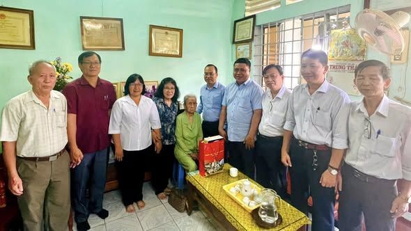 Đoàn công tác chụp ảnh lưu niệm cùng bà Trần Thị Hòa (ngồi ghế) là cựu tù cách mạng