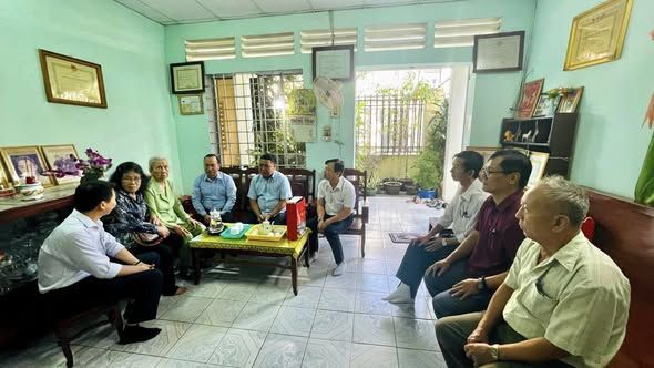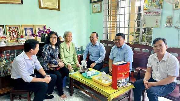 Ông Phan Công Khanh – Phó Bí thư, Chủ tịch UBND phường (thứ 3, bìa phải), ông Nguyễn Thái Bình – Ủy viên Ban Thường vụ, Chủ tịch UBMTTQ Việt Nam phường (bìa phải) và và ông Đoàn Đình Hữu - Ủy viên Ban Thường vụ, Phó Chủ tịch UBND phường (thứ 2,bìa phải) thăm hỏi bà Trần Thị Hòa (thứ 3, bìa trái) là cựu tù cách mạng