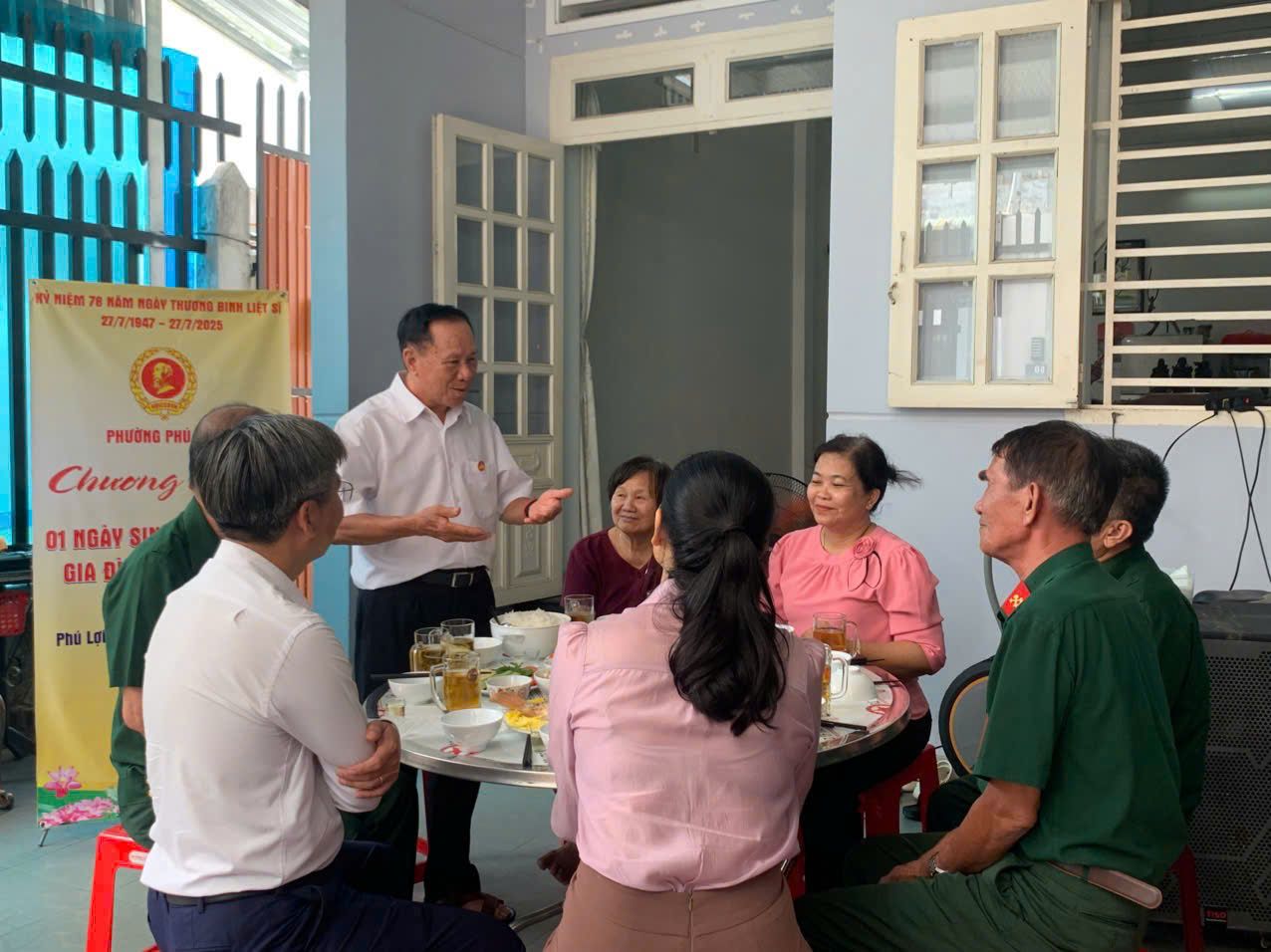 Tham dự chương trình có bà Lê Thị Kim Cúc - UV BTV Đảng ủy, Chủ tịch Ủy ban MTTQ Việt Nam phường; bà Vi Thị Tâm Lai - UV BCH, Phó Chủ tịch MTTQ Việt Nam phường; cùng cán bộ, đoàn viên Đoàn Thanh niên Cộng sản Hồ Chí Minh phường; đại diện Chi ủy, Ban điều hành, Ban công tác Mặt trận khu phố Hiệp Thành 5 phường Phú Lợi đến thắp hương tri ân liệt sĩ, hỏi thăm sức khỏe, động viên ông bà cố gắng sống vui, sống khỏe cùng con cháu. Chương trình “1 ngày sinh hoạt cùng gia đình chính sách” với bữa cơm nghĩa tình, có đầy đủ các món ăn mang đậm hương vị quê hương, thể hiện sự biết ơn và trân trọng của các đoàn thể, của thế hệ trẻ hôm nay đối với sự hy sinh, cống hiến của các thế hệ đi trước trong công cuộc đấu tranh bảo vệ, xây dựng và phát triển quê hương, đất nước. Chỉ khi trực tiếp sinh hoạt, ngồi vào mâm cơm đặc biệt ấy, mới cảm nhận được không khí vui vẻ, gần gũi, ấm áp, đầy tình yêu thương mà đoàn công tác, thế hệ trẻ của phường dành cho gia đình có công, diễn ra trong không khí đầm ấm, vui vẻ.