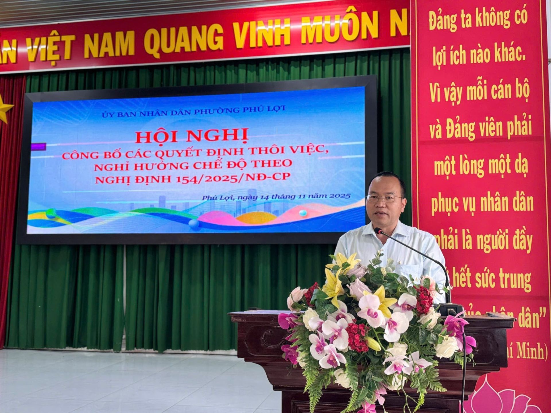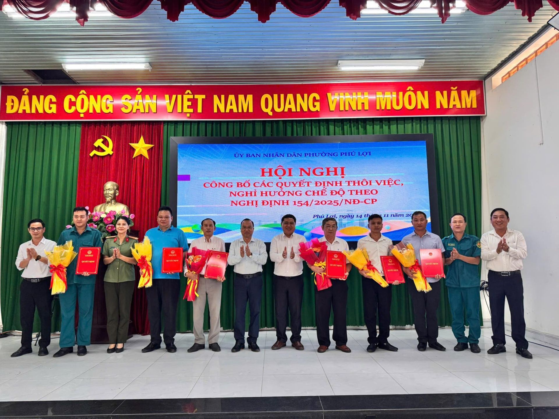Theo đó, Chủ tịch UBND phường Phú Lợi Phan Công Khanh đã trao các quyết định thôi việc, nghỉ hưởng chế độ theo Nghị định 154/2025/NĐ-CP đối với 11 cán bộ, người hoạt động không chuyên trách của phường.