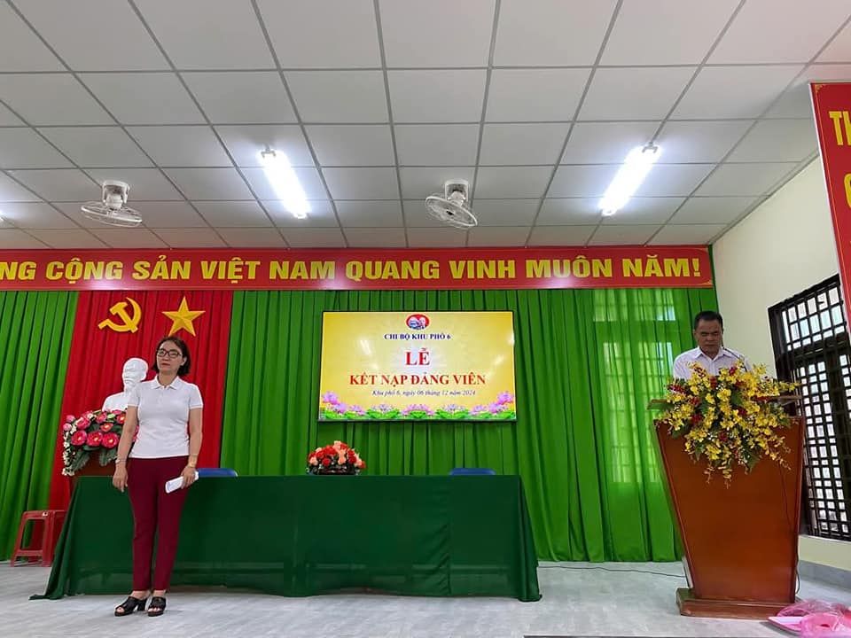 Trong không khí trang nghiêm của buổi lễ, ông Đoàn Thanh Phương - Bí thư Chi bộ khu phố 6 đã trao Quyết định kết nạp Đảng và chúc mừng quần chúng ưu tú Lê Thị Thảo được kết nạp vào đảng. Dưới cờ tổ quốc, cờ đảng và chân dung Chủ tịch Hồ Chí Minh cùng sự chứng kiến của Đảng viên trong Chi bộ, Bà Lê Thị Thảo đã tuyên thệ và gửi lời cảm ơn sâu sắc đến Cấp ủy Chi bộ và toàn thể đảng viên đã luôn quan tâm, dìu dắt, giúp đỡ và xin hứa sẽ nỗ lực không ngừng để hoàn thành nhiệm vụ của người Đảng viên Đảng Cộng sản Việt Nam.