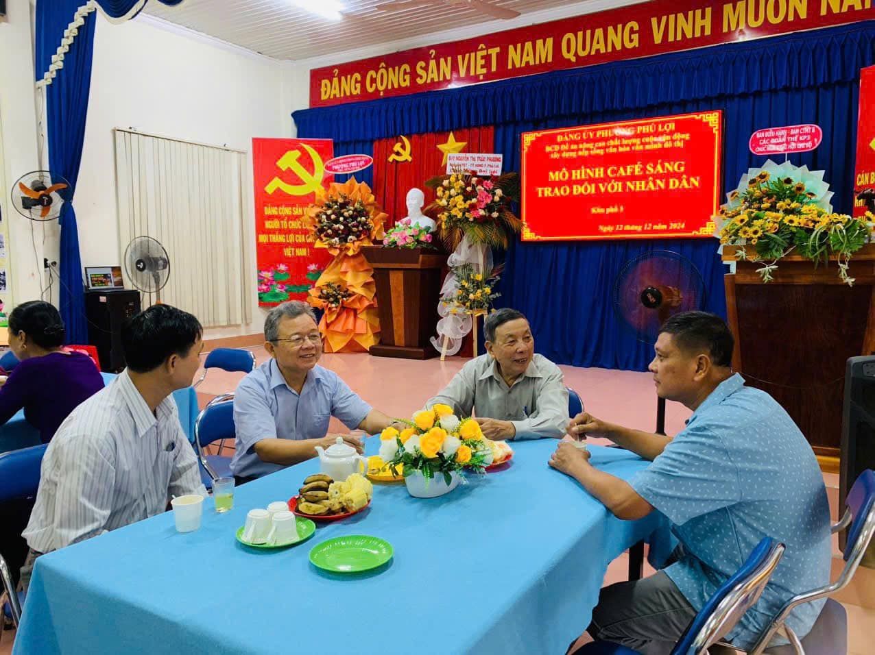 Sáng ngày 12/12/2024, tại Văn phòng khu phố 3, Ban chỉ đạo Đề án Xây dựng “Nếp sống văn hóa - Văn minh đô thị” phường Phú Lợi tiếp tục thực hiện mô hình “Cà phê sáng – trao đổi với nhân dân”. Tham dự có các đồng chí Thường trực Ban chỉ đạo Đề án, các đồng chí lãnh đạo Hội đồng nhân dân – Ủy ban nhân dân – Ủy ban Mặt trận Tổ quốc Việt Nam phường; cùng các ông, bà là Bí thư Chi bộ, Trưởng khu phố, Trưởng ban Công tác Mặt trận, các đoàn thể và nhân dân khu phố 3 với hơn 20 người dân tham gia.