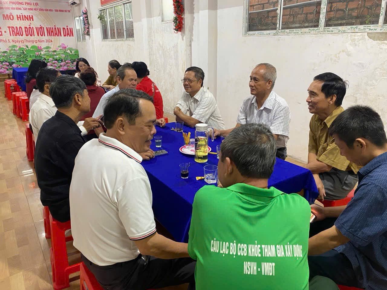 Sáng ngày 13/12/2024, tại Văn phòng khu phố 5, Ban chỉ đạo Đề án Nâng cao chất lượng cuộc vận động xây dựng “Nếp sống văn hóa - Văn minh đô thị” phường Phú Lợi tiếp tục thực hiện mô hình “Cà phê sáng - trao đổi với nhân dân”. Tham dự có các đồng chí Thường trực Ban chỉ đạo Đề án, các đồng chí lãnh đạo Hội đồng nhân dân – Ủy ban nhân dân – Ủy ban Mặt trận Tổ quốc Việt Nam phường; cùng các ông, bà là Bí thư Chi bộ, Trưởng khu phố, Trưởng ban Công tác Mặt trận, các đoàn thể và nhân dân khu phố 5 với hơn 20 lượt người tham gia. Tại buổi gặp gỡ, lãnh đạo địa phương nhận được 01 ý kiến góp ý của người dân về việc đầu đường 1/12 có garage ô tô thường xuyên sơn xe gây mùi hôi làm ảnh hưởng đến sức khỏe của người dân.