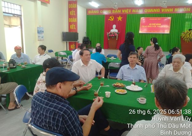 Sáng ngày 26/6/2025, tại Văn phòng khu phố 7, Ban chỉ đạo Đề án nâng cao chất lượng cuộc vận động xây dựng “Nếp sống văn hóa - Văn minh đô thị” phường Phú Lợi tiếp tục thực hiện mô hình “Cà phê sáng - Trao đổi với nhân dân”. Tham dự có các đồng chí Ban Chấp hành Đảng bộ phường, Thường trực Ban chỉ đạo Đề án, các đồng chí lãnh đạo Hội đồng nhân dân – Ủy ban nhân dân – Ủy ban Mặt trận Tổ quốc Việt Nam phường; cùng Cấp ủy Chi bộ, Ban điều hành khu phố, Trưởng ban Công tác Mặt trận, các đoàn thể và nhân dân khu phố 7 với hơn 30 người dân tham gia.