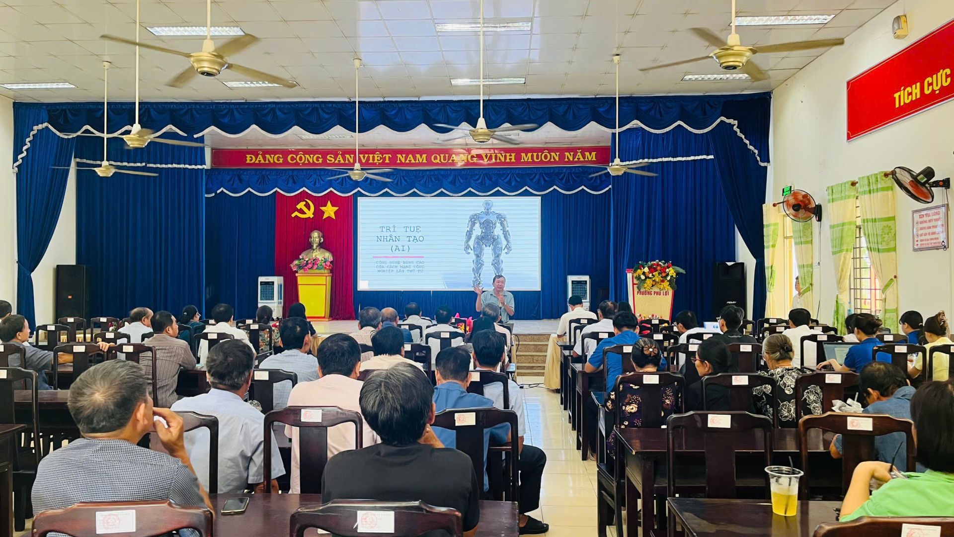 Tại buổi lễ, UBND phường đã tổ chức triển khai giới thiệu Tổng quan trí tuệ nhân tạo hiện đại, những thành tựu, bước tiến, kỳ vọng cho tương lai; ứng dụng AI trong công việc, đời sống; hướng dẫn nền tảng học trực tuyến tỉnh Bình Dương, ...