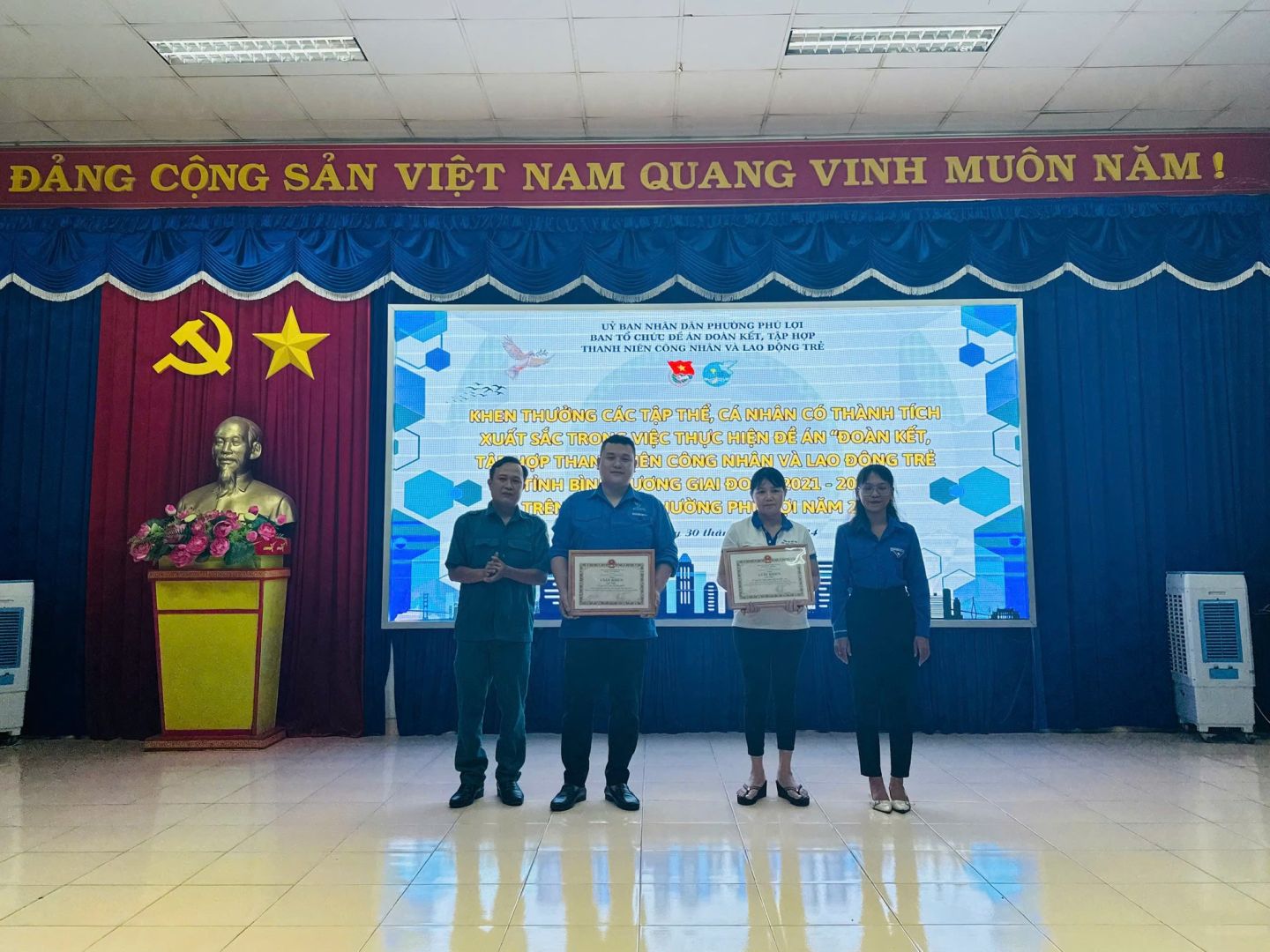 Trong khuôn khổ chương trình, Ban tổ chức Đề án phường đã trao khen thưởng của UBND phường đối với 02 tập thể và 04 cá nhân có thành tích xuất sắc công tác thực hiện Đề án “Đoàn kết, tập hợp thanh niên công nhân và Lao động trẻ tỉnh Bình Dương, giai đoạn 2021 – 2025” trên địa bàn phường Phú Lợi năm 2024.